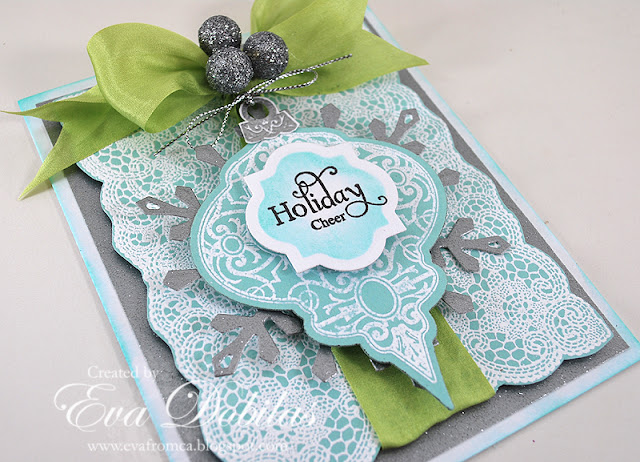 Lace Background Stamp in my background. I love the way this card turned out, and it was pretty easy to achieve it. I white embossed my images on card stock and layered them onto silver glitter card stock. My pretty bow is by