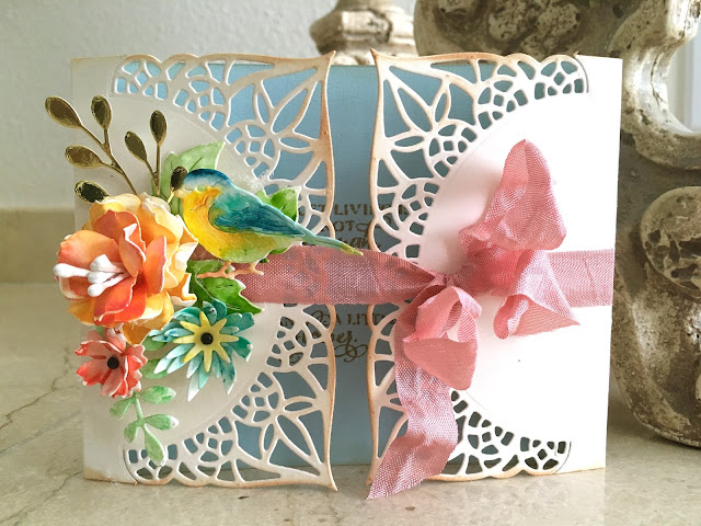 I tied a ribbon around my card to have a closure for it and started layering my flowers and bird and finally added some pearls in the middle of the flowers. I also die cut one of the elements from the